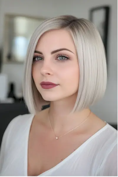 Ce bob platine en ligne A enraciné est idéal pour tous les tons de peau, et ils peuvent basculer ce look parce que la couleur contient des tons chauds et frais.